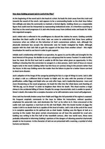 There are no adults? This refers to the choir walking along the beach in the distance. The choir are a militaristic group? This shows us that their leader is in total control of the group. This leader is Jack? When the choir reach the platform, Jack shows off? This is an attempt to impress the group, create a good impression, lord of the flies jack essay, enough so he commands their respect as well as the choirs?